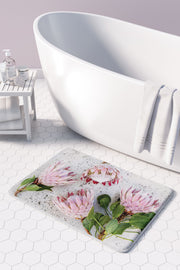 FLORAL PINK PROTEAS ON WHITE BATHMAT