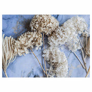 FLORAL CREAM BLEACHED HYDRANGEAS ON BLUE TABLECLOTH